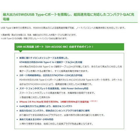 グリーンハウス USB-AC充電器 2ポート 65W USB Type-Cケーブル付き ブラック[USB Power Delivery対応 /2ポート /GaN(窒化ガリウム) 採用] GH-ACU2GC-BK