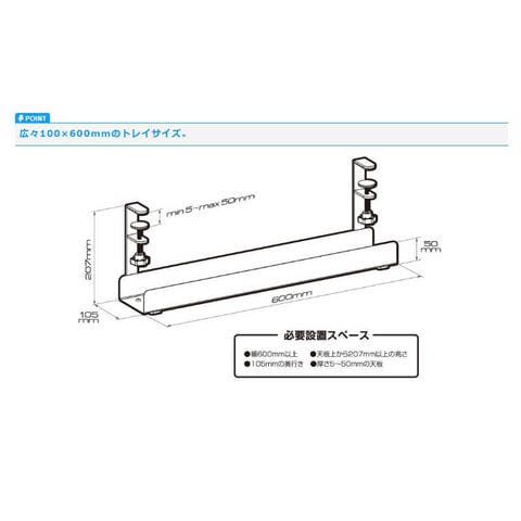 仕様1:[設置スペース]幅600mm以上、天板上から207mm以上の高さ、105mmの奥行き、厚さ5~50mmの天板。[対応する天板の厚さ]5~50mm[耐荷重]5kg[外形寸法]W600×D105×H207mm[重量]約1.4kg[材質]スチール、プラスチック[付属品]六角棒レンチ(3mm)、取扱説明書/保証書