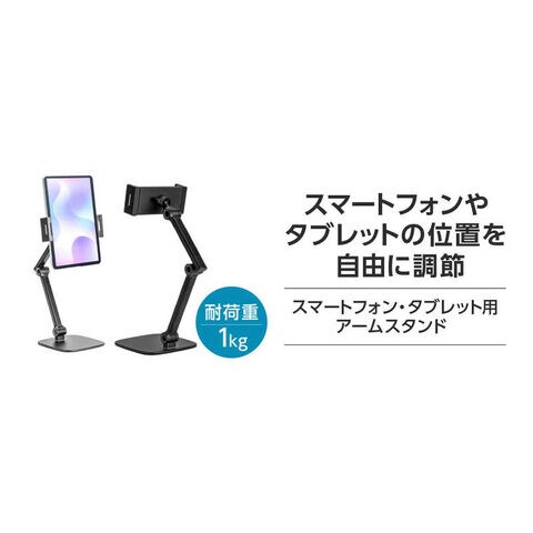 仕様1:[対応端末サイズ]幅128~224mm、厚さ15mm以下のスマートフォンやタブレット[設置スペース]154×154mm以上の設置スペースが必要です。[耐荷重]1kg[外形寸法]W154×D154×H413mm[重量]約1.1kg[材質]スチール、アルミ、プラスチック[付属品]六角棒レンチ(3mm/4mm)、取扱説明書/保証書
