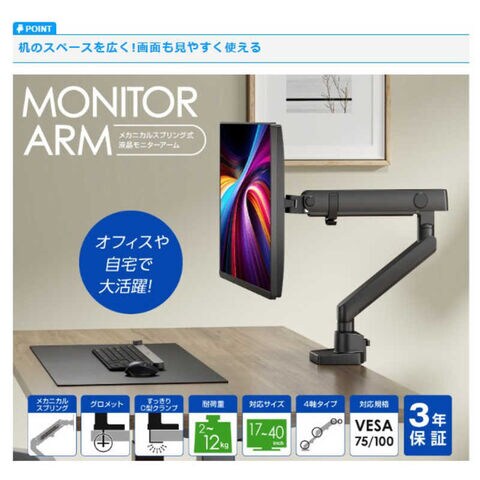 仕様1:[対応サイズ]17~40インチまでのモニター[対応規格]VESAマウントインターフェース規格(FPMPMI) 100mm/75mm[耐荷重]2kg~12kg※2kg未満の液晶モニターは使用できません。