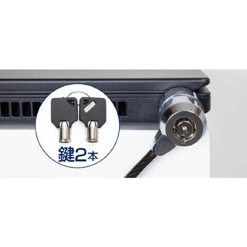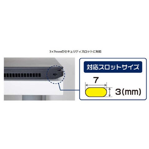 仕様1:[対応機種]セキュリティスロット(3mm×7mm)を搭載したノートパソコンや液晶ディスプレイなど※機器によっては内部の奥行きが対応しない場合があります。[ワイヤー長]180cm[ワイヤー径]4.0mm[対応スロットサイズ]3×7mm[付属品]シリンダキー2本
