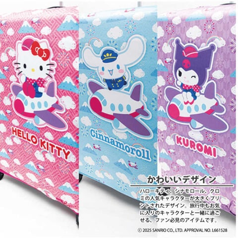◇大きなスーツケースもカバーできる◇底のゴムバンドでしっかり固定◇ハローキティ、シナモロール、クロミの3種◇材質:ポリエステル・ポリウレタン◇本体サイズ:(約)H75×W70cm◇対応サイズ目安:(約)90~106L、W47~52×H68~75×D30~35cm(キャスター除く)◇重量:(約)175g