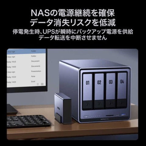 120W UPS無停電電源 停電時に即座に起動し、NASへ120Wの安定した出力を供給。