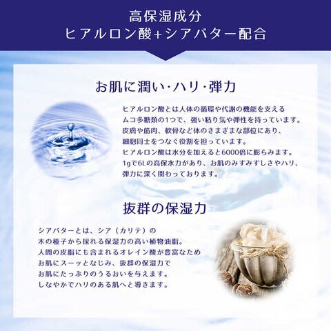 ●保湿成分 ヒアルロン酸&シアバター配合で、お肌にうるおいを与え、洗い終わった後もしっとり感が続きます。