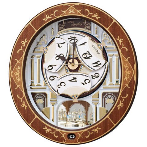 ●楕円形の枠をキャンバスに見立て、華麗なバラの花をモチーフにした木象嵌で描いた電波からくり掛け時計。