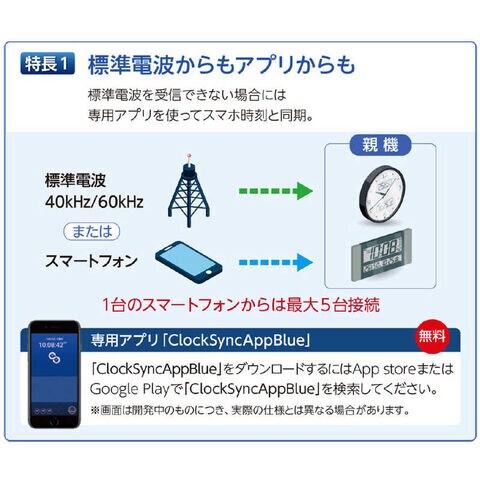 ・標準電波を受信できない場所には専用アプリを使ってスマホ時刻と同期できます。