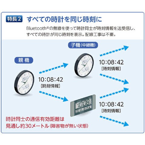 ・Bluetoothの無線を使って時計同士が時刻情報を送受信します。つまり、すべての時計が同じ時刻を表示。(時計同士の通信有効距離は見通し約30m ※障害物がない状態)