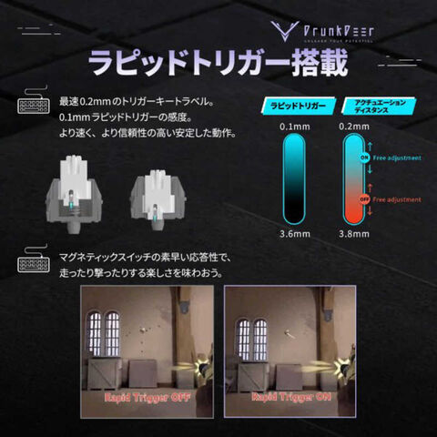 また、キーが上昇すると入力がリセットされ、より素早いキー入力を可能にするラピッドトリガー機能を搭載しており、ラピッドトリガーの感度も0.1mm-3.6mmの間(0.1mm刻み)で設定することができます。