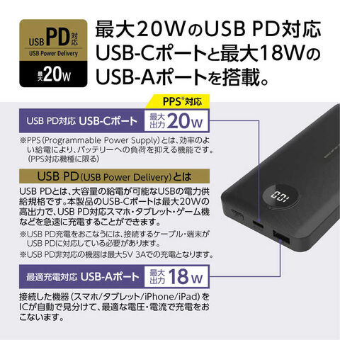 多摩電子工業 PD20W対応10000mAhモバイバッテリー ブラック TLP151UCK