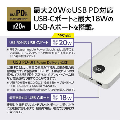 多摩電子工業 PD20W対応10000mAhモバイバッテリー ホワイト TLP151UCW