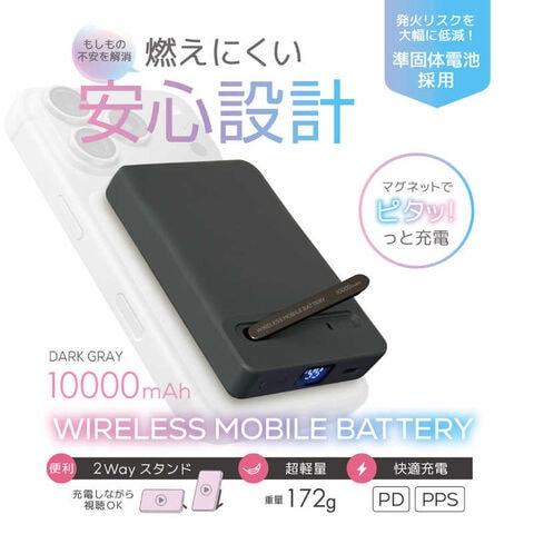 【2026年02月20日発売予定】オズマ ワイヤレス準固体モバイルバッテリー 10000mAh PD20W スタンド付 [USB Power Delivery対応 / 2ポート] ダークグレー SSLC2W100-CCDG