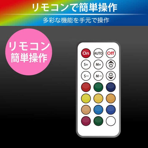 点灯・消灯、流れるイルミネーションのパターン変更、単色カラーの選択、明るさの調整など、すべての操作が手元で簡単操作。