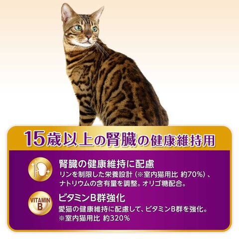 腎臓の健康維持に配慮して、リンを制限した栄養設計*室内猫用比約70%)、ナトリウムを調整、オリゴ糖・カリウムを配合。