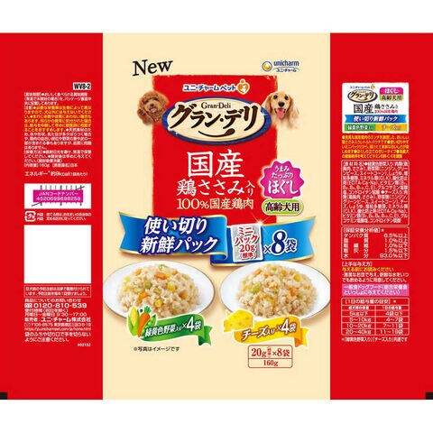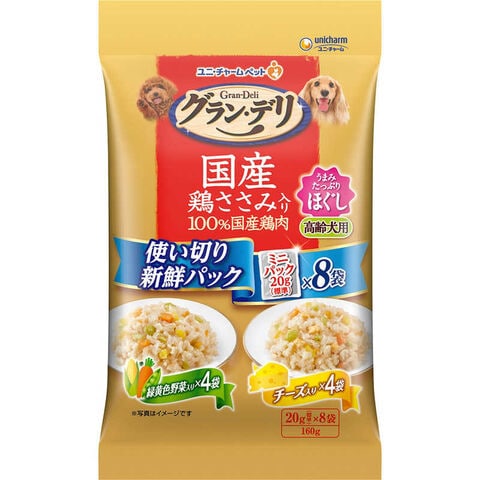 ユニチャーム グラン・デリ 国産鶏ささみ入りパウチ 使い切り新鮮パックほぐし 高齢犬用 緑黄色野菜入り&チーズ入り 160g(20g×8)