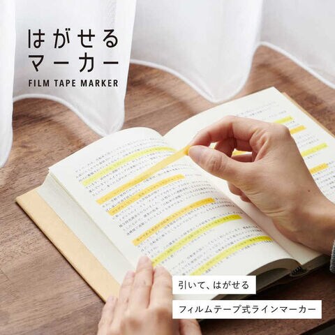 『はがせるマーカー』はインク汚れの心配がなく、紙面にじかに書き込まない&あとで「消せる」からこれまでになく気軽にラインを引ける、フィルムテープ式ラインマーカーです。