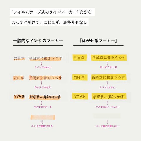 従来のインク式ラインマーカーにありがちなインク汚れや色むら、裏移り、文字のにじみなどが無く、まっすぐ均等なラインが引けて不要なラインははがして「消す」ことができるので、きれいな紙面を保ちながら、これまでになく気軽にラインマーカーを活用できます。