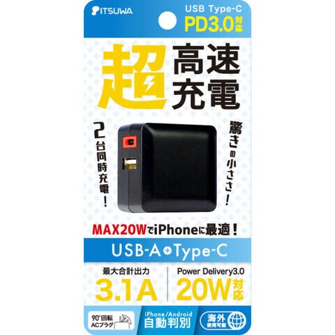 イツワ商事 PD20W AC充電器 コンパクト Type-C×1、USB-A×1 MCAC2101BR