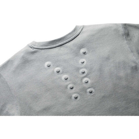 肌側を綿、外側をポリエステルに編み分けた、ワッフル構造のサーマルニット生地は、凹凸組織により肌離れよく、汗をかいてもベタつきません。