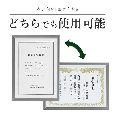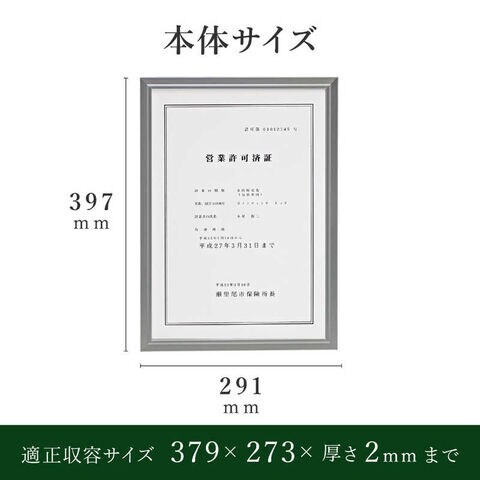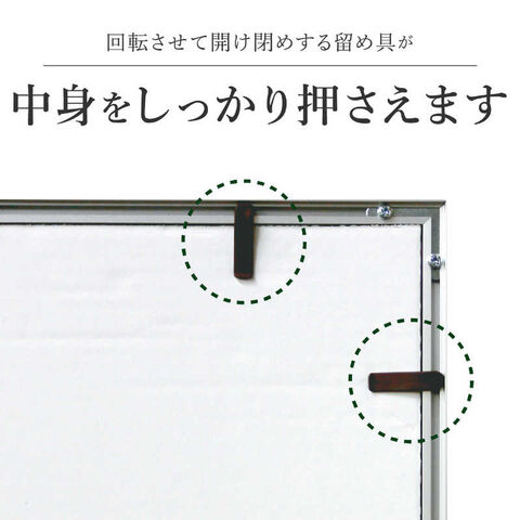 仕様1:材質/枠:アルミ、表面:PET、裏面:段ボール(古紙パルプ)。つり紐付:長さ120cm収容する作品の厚さは2mmまで本体サイズ(縦×横):397×291mm適正用紙サイズ(縦×横):379×273mm