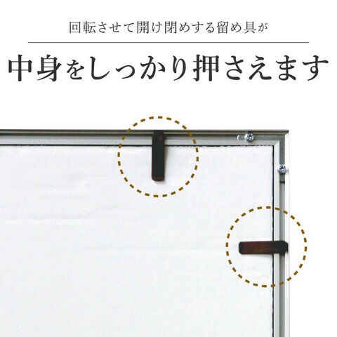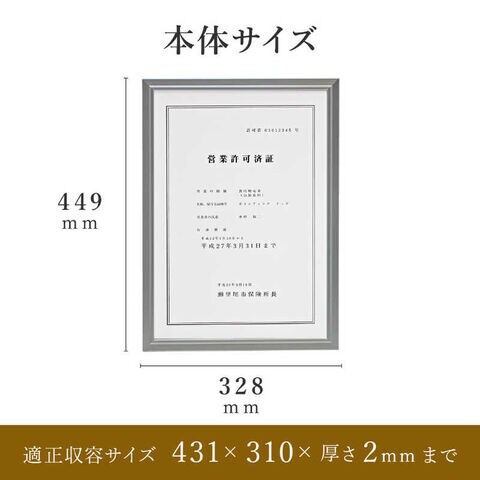 仕様1:材質/枠:アルミ、表面:PET、裏面:段ボール(古紙パルプ)。つり紐付:長さ160cm収容する作品の厚さは2mmまで本体サイズ(縦×横):449×328mm適正用紙サイズ(縦×横):431×310mm