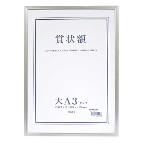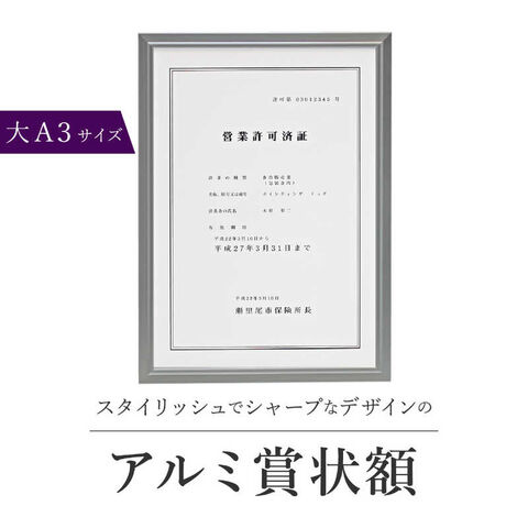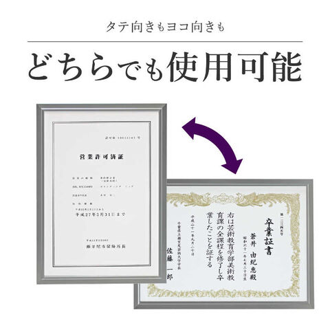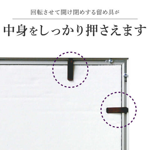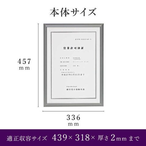 仕様1:材質/枠:アルミ、表面:PET、裏面:段ボール(古紙パルプ)。つり紐付:長さ160cm収容する作品の厚さは2mmまで本体サイズ(縦×横):457×336mm適正用紙サイズ(縦×横):439×318mm