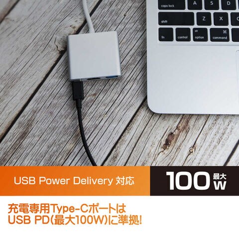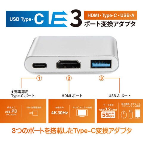 USB Type-Cコネクタを搭載したスマホ・タブレット・パソコンに接続することで、HDMI(映像出力)、USB A(USB3.2)ポート、Type-C(給電)ポートを増設できる3in1変換アダプタです。