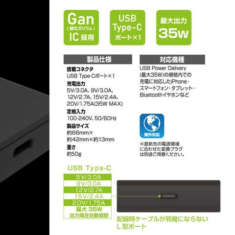 Type-Cポートタイプ、PD対応、Gan搭載、最大出力35W。
