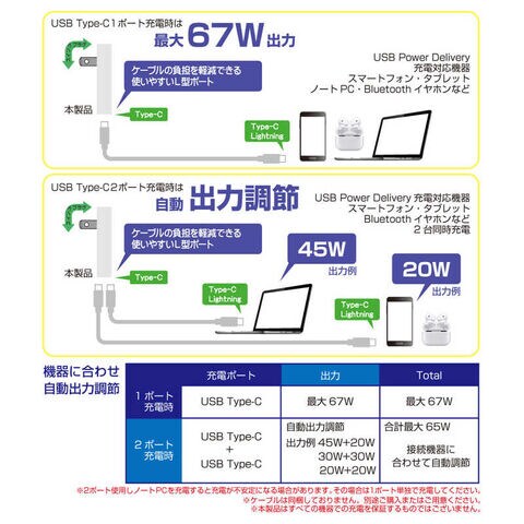 定格出力電力:USB Type-C 1ポート使用時:5V/3A、9Ⅴ/3A、12V/3A、15V/3A 20V/3.35A(67W MAX)PPS:3.3-11V/5AUSB Type-C 2ポート同時使用時:(45W+20W、30W+30W出力例)(total 65W MAX)