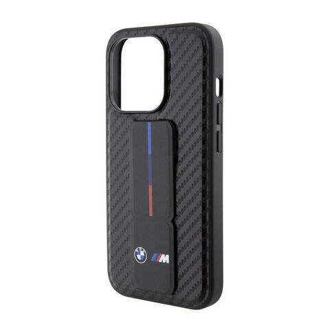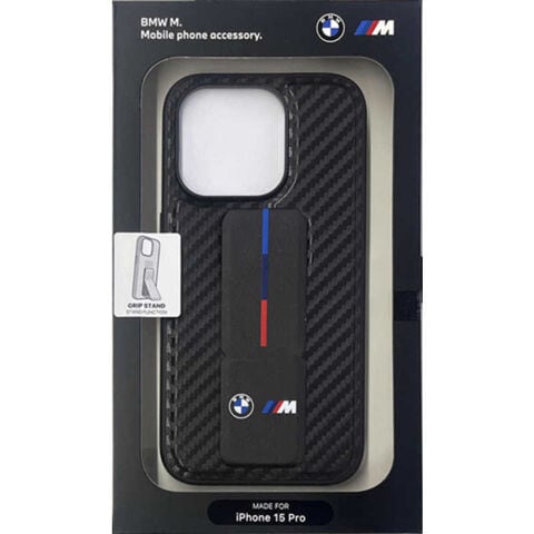 エアージェイ BMW iPhone15 Pro用 PUカーボン グリップスタンド 背面ケース ブラック BMHCP15LGSPCCK