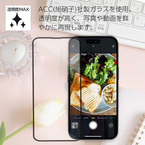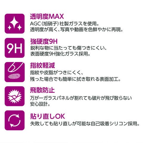 AGC(旭硝子)社製ガラスを使用。透明度が高く、写真や動画を色鮮やかに再現。