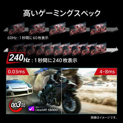 垂直走査周波数(Hz):[リフレッシュレート]240Hz(Display Port・HDMI)[走査周波数]30 ~ 390 KHz(H) / 48 ~ 240 Hz(V)