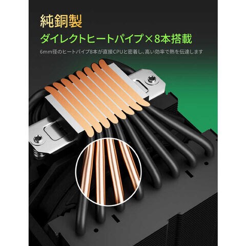 純銅製ダイレクトタッチ式ヒートパイプ×8本 純銅製ダイレクトタッチ式ヒートパイプを8本搭載し、CPUの熱を効率的に吸収しすることで優れた冷却性能を発揮します。