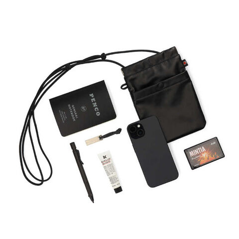 外側にはワイヤレスイヤホンやペンなど、細かなものが収納可能なボタン式のフロントポケットや、鍵やチャーム等をフック等でぶら下げることの出来るショルダー紐と同色のミニループも付いています。