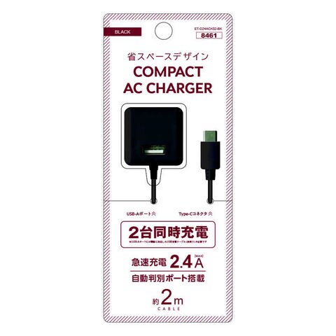 アベル 小型AC充電器Type-Cケーブル直結Aポート付 2.4A 2m ブラック ET-O24ACK02-BK