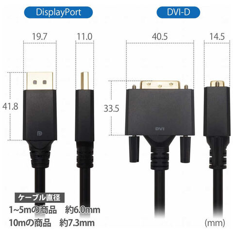 仕様1:[コネクタ形状]Displayport(オス)-DVI-D(オス)[コネクタサイズ] Displayport(オス):W約20.3 x H約11.0 x D約56.5 mm DVI-D(オス):W約41.3 x H約15.0 x D約54.2 mm[ケーブル直径]1m~5mは約6mm、10mは約7.3mm[インチナット]#4-40UNC[最大解像度]1920x1200