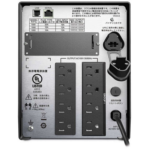 仕様1:[定格入力電圧]100V[定格出力電圧]100V[定格電力]980W[定格電力]1200VA[製品またはコンポーネントタイプ]無停電電源装置 (UPS)[入力プラグ形状]NEMA 5-15P[出力コンセント形状×数]8 NEMA 5-15R[ラックユニット]0U[ケーブルの長さ]1.8 m[ケーブルの数]1[バッテリー形式]鉛蓄電池[製品群]Smart-UPS[通信ポートの種類]スマートスロット