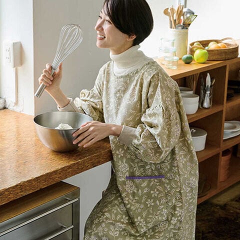 ・すっきりと着られる大人シックなデザインのかっぽうぎ。