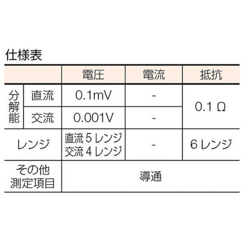 ●直流電圧(V):500●交流電圧(V):500●直流電流(A):-●交流電流(A):-●抵抗(Ω):41.99M●連続使用時間:150時間●質量(g):60