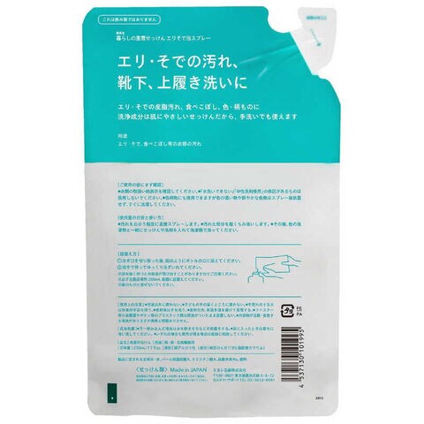 ワイシャツ等のエリ・そでの気になる汚れにシュッとひと拭き簡単部分洗い。弱アルカリ性の重曹と弱アルカリ性のせっけん成分で相性の良い組み合わせで弱酸性の皮脂汚れをパワルに落としながら手肌にやさしい。