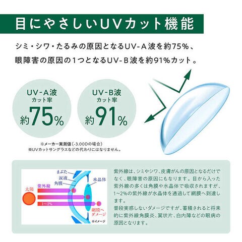 シミ・シワ・たるみの原因となるUV-A波を約75%、眼障害の原因の一つとなるUV-B波を約91%カット。