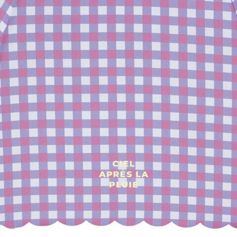ポップなカラーのギンガムチェックに、ワンポイントのロゴを配置し、レトロかわいい雰囲気に仕上げました。