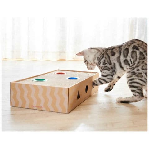 穴の中をころころと転がるボールを追いかけて遊びます。3色のボールは猫にも色の違いを目で見て分かるカラフルな色を採用。赤色と青色のボールには鈴が入っていて鈴の音がしたり、緑色のボールにはキャットニップが入っていて猫の好きな香りがします。上部は爪とぎ素材を使用。