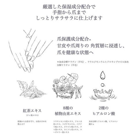 紅茶エキス(チャ葉エキス:保湿成分)・植物エキス配合で、乾燥から手肌・爪先を守り、しっかりと潤いをキープします。
