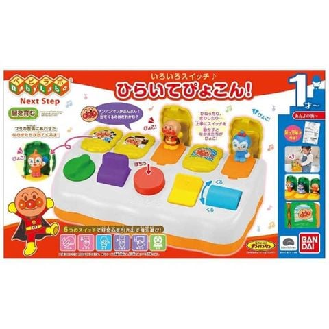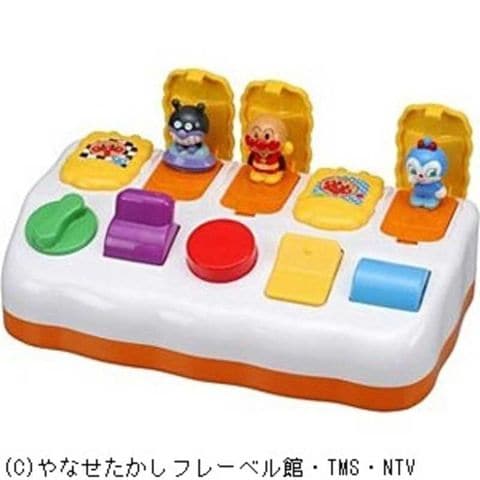 「ひねる」「さげる」「おす」「たおす」「まわす」の5つのスイッチで指先の練習!フタに描かれたアンパンマンの表情に合わせたキャラクターが出てきて興味しんしん!!