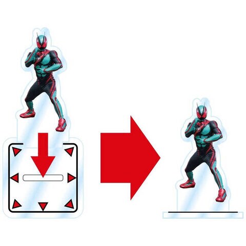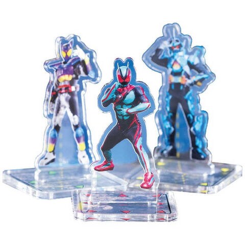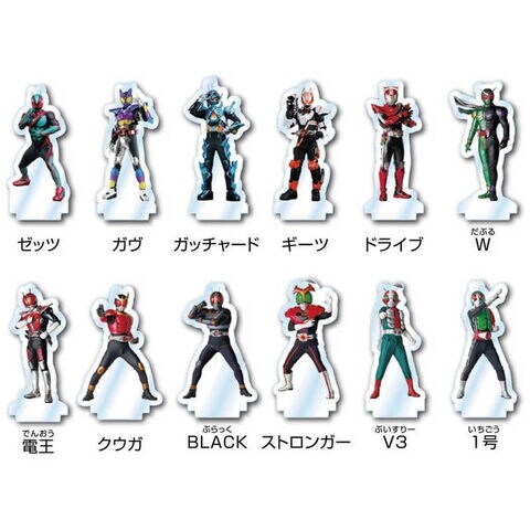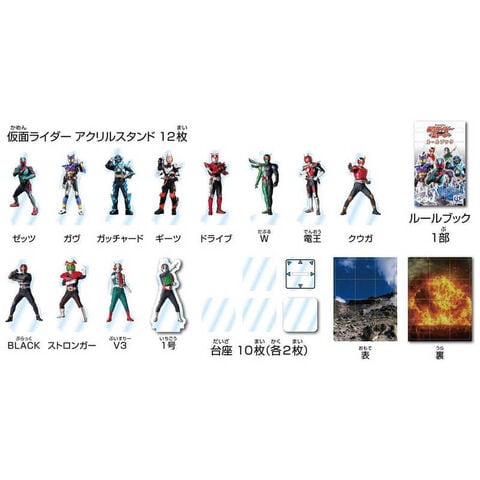 仮面ライダーシリーズより12作品の主人公キャラクターが描かれたアクリルスタンドコマで、自由にチームを編成して遊ぶことができます。