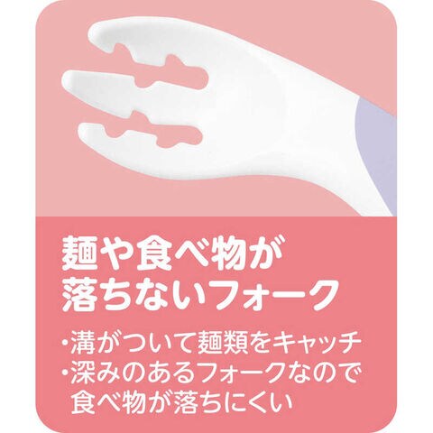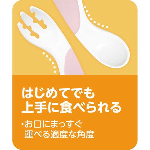 お口にまっすぐ運べる2つの角度で、手首をうまく動かせないベビーでもじょうずに食べられます。