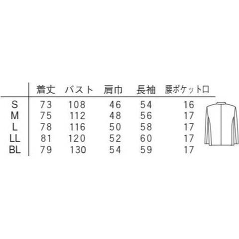 仕様1:仕上がり寸法(cm)M:着丈75、胸囲112、肩幅48、袖丈56、腰ポケット口17
