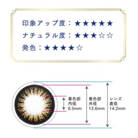 瞳をくっきり見せるサイズ。フチありカラコンでより印象的に。