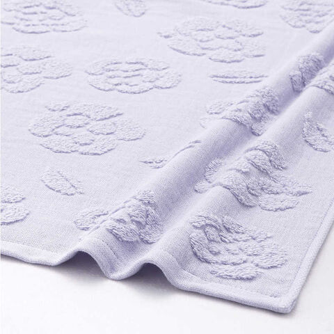 今治タオルならではの、無撚糸のふわふわ感とガーゼのさらっとした肌触りを同時に楽しめるタオルです。シンプルながらも可愛らしい花柄のデザインが、優しい風合いで癒しのひとときを演出します。