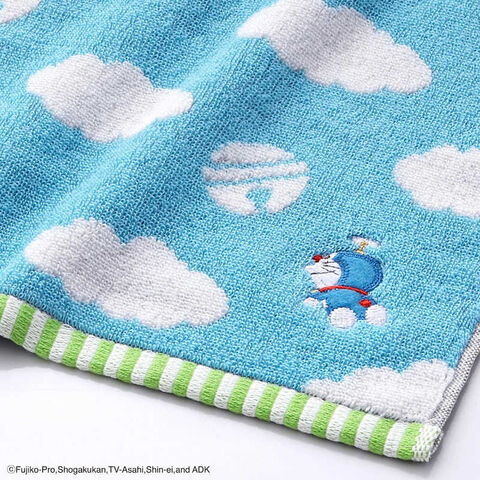 タオル一面が空のデザインとなっており、タケコプターで飛んでいるドラえもんのアップリケが可愛い1枚です。